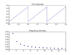 The diagram shows, in the chart on top, 3 cycles of a sawtooth wave with a frequency of 1 Hz (too low to hear, but makes the numbers easier to understand), and in the chart below, the amplitudes of the first few frequency components from the Fourier transform. In this case the strongest component is the fundamental (and note also the zero component at 0 Hz), with higher harmonics getting progressively weaker but never quite disappearing. Other periodic waveforms can have quite different harmonic distributions.