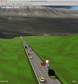 - Pause: stops the time. The duration of a time-step is reduced to zero but cars continue to act. This option is very useful to debug a car behavior as we will see in the tutorial section of this documentation.