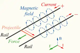 As stated, railguns utilize an electromagnetic force called the Lorentz force to propel an electrically conductive projectile that is initially part of the current path. The current flowing through the rails sets up a magnetic field between them and through the projectile perpendicularly to the current in the rail. In short, the rails and the projectile push away from each other, and you wind up throwing a hunk of metal away from wherever the battery is connected.
