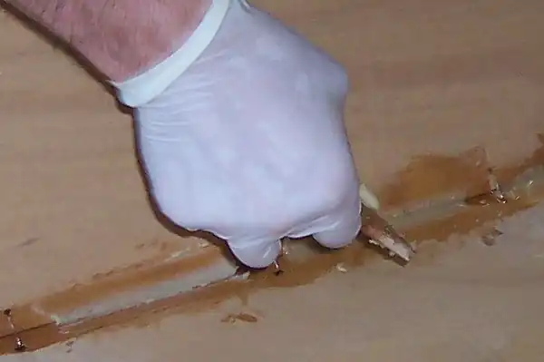 Once the epoxy and hardener has been dispensed in the correct ratio it is essential to make sure it is thoroughly mixed. Stir the mixture carefully for several minutes with a flat, disposable stirrer. Some thin plywood offcuts trimmed to size are ideal.