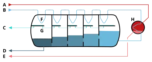 D – brine out (waste) E – condensate out F – heat exchange G – condensation collection (desalinated water)