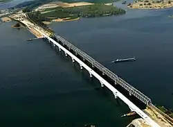 Een hoge brug, een groot meer |