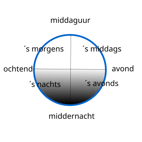 In Dutch, rather than using am/pm, the 24 hours of a day are roughly divided in four 6 hour periods with four adverbial expressions. Click on the arrows to hear the pronunciation.