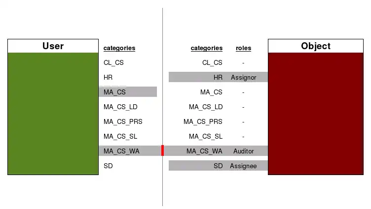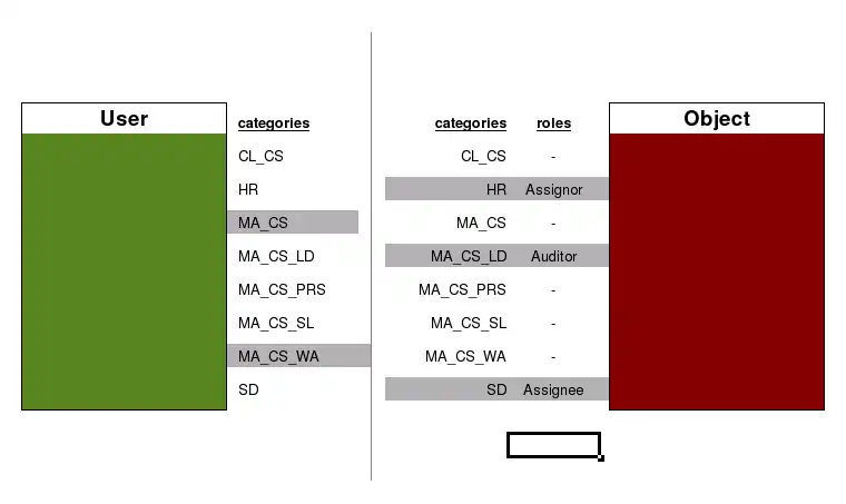 As each object can have different security categories, user can obtain different roles for different objects. If another object has the following category: [('HR','Assignor'),('SD','Assignee'),('MA_CS_LD','Auditor')] the user from the first example will not get any role and thus will not be able to access the object.