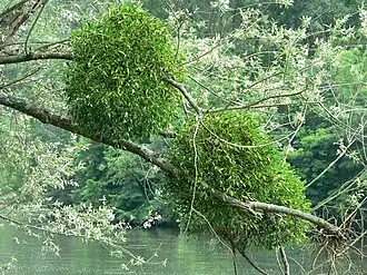 Most epiphytic plants do not harm their host and do not use nutrients from the host, but some, such as mistletoe, are parasitic. The berries from mistletoe are covered with a sticky laxative coating and are spread by birds. These seeds develop haustorium when germination begins and penetrate the bark of young trees. Lethal infections can subsequently occur.