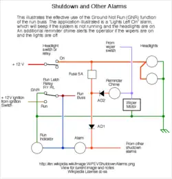 Some visual indication of system readyness should be provided, since there will be no noise or vibration from an idling engine. Often a converter will simply ensure that the low battery light will be illuminated whenever accessory power is available. More sophisticated systems will illuminate a ready light when the run circuit is active. If provided, this run light may be configured to illuminate at a lower brightness when running at night. The run circuit may also be routed to a dashboard voltmeter. By providing a push-button that switches this voltmeter to a constant battery circuit (e. g. the clock power), this meter may also be used to partially diagnose non-starting conditions.