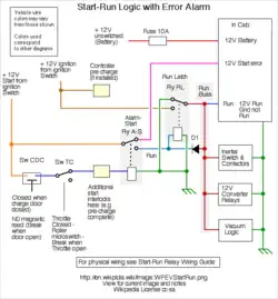 The goal is to make the vehicle operate safely and to be started using the Start keyswitch position - similar to a conventional ICE vehicle. The continuation of the run state here requires that the vehicle's ICE ignition circuit be active to operate, enabling the keyswitch to be used to reliably shut off the system. The start-run circuit should control application of pack voltage throughout the system by activating the main contactors and by applying pack voltage to the twelve volt converter. This will also control the operation of the vacuum pump, which from a cold start (zero vacuum) also offers the effect of an acoustic signal that the vehicle has started, but is not yet ready for service until the low vacuum warning is off.