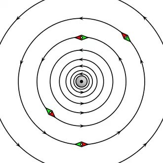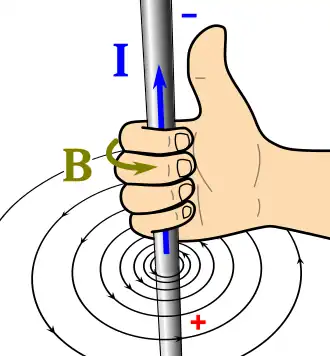 With the Biot-Savart law, we can calculate the magnetic field produced by an electric current. If the wire is straight and of infinite length, the lines of the magnetic field are circles centered on the wire: