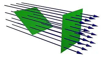 Let be a sufficiently small surface element so that we can assume that the vector field is almost constant. Let be a vector of unit length perpendicular to . The flux from through in the direction of is then