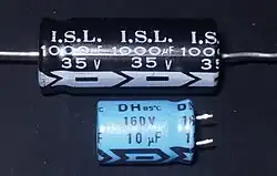 Axial 1000 µF capacitor with a maximum voltage rating of 35 V (black), and radial 10 µF capacitor with a maximum voltage rating of 160 V (blue).