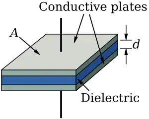 A dielectric is the material between the two charged objects. Dielectrics are insulators. They impede the flow of charge in normal operation. Sometimes, when a too large voltage has been reached, charge starts flowing. This is called dielectric breakdown and destroys the capacitor. Beginners sometimes misunderstand this. Timing circuits do measure the rate at which a capacitor charges, but they measure a threshold voltage instead of allowing the voltage to build up until dielectric breakdown. (A device which does function this way is a spark gap.)