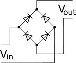 - A diode circuit that 'rectifies' alternating current (AC) into direct current (DC). The bridge rectifier is a full-wave rectifier, meaning that both the positive and negative portions of the wave become positive. (In a half-wave rectifier, positive stays positive, and negative becomes zero.) The bridge rectifier has advantages over other full-wave rectifier designs, because it reduces peak-inverse voltage (PIV), the largest negative voltage across a single junction diode. By reducing the PIV, it becomes possible to use diodes with lower breakdown (Zener) voltages. This allows the use of cheaper diodes to perform the same function.