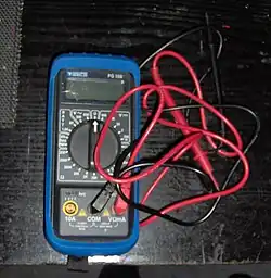 Multimeters contain Ohmeters, Voltmeters, Ammeters and a variety of capabilities to measure other quantities. AC and DC voltages are most often measurable. Frequency of AC voltages. Multimeters also feature a continuity detector, basically an Ohmmeter with a beeper if the multimeter sees less than 100 Ω then it beeps otherwise it is silent. This is very useful for finding whether components are connected when debugging or testing circuits. Multimeters are also often able to measure capacitance and inductance. This may be achieved using a Wien bridge. A diode tester is also generally onboard, this allows one to determine the anode and cathode of an unknown diode. A LCD display is also provided for easily reading of results.