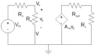 The model for the op-amp is shown in Figure 1. Where V+ − V is equal to vd; Rin is the input impedance; Rout is the output impedance; Avo is the open loop gain; and Rs is the source impedance.