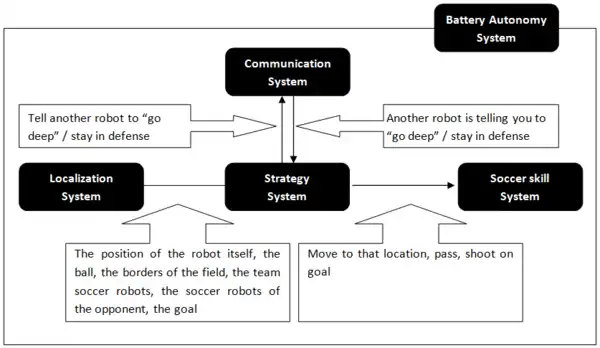 Each subsystem becomes the responsibility of a group of people, mostly specialist. The “strategy system” for example is awarded to the “strategy team”, a group of software engineers. It can be seen that some subsystems are overlapping different groups: a good pass needs good skills but also good communication and localization … It is clear that a good cooperation of the different groups is a must. A graphical overview of the different subsystems and their cooperation is given in Figure 1.