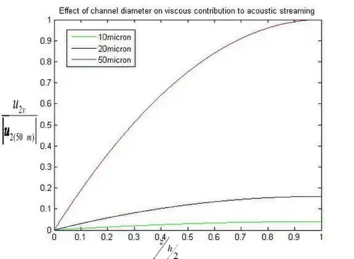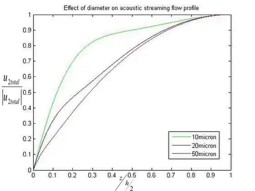 These two expressions are summed when calculating the velocity profile across the diameter of the pipe. With no-slip conditions, the outer boundary layer streaming contribution to the acoustic streaming velocity decreases as the diameter decreases with a with a profile similar to Hele-Shaw flow in infinitely wide rectangular channels [7]. Figure 1 shows this diameter scaling effect in water with an acoustic velocity and a driving frequency of 2 MHz.
