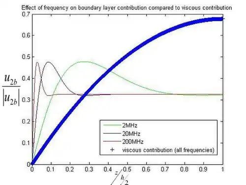 Driving frequency does have an effect on the velocity profile for a channel of constant diameter that experiences a sizable contribution from the boundary layer. The frequency dependence on the inner boundary layer contribution is evident for a channel with typical paramaters for water and an acoustic velocity in Figure 4. Note that the viscous contribution to acoustic streaming is also shown, but does not exhibit a frequency dependence. For small channels (less than 10 microns), the inner boundary layer streaming affects a more sizable portion of the channel at lower frequencies.