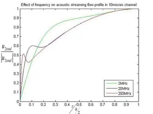 The total acoustic streaming flow profile is then given in Figure 5. From this plot, matching the driving frequency to channel geometry is important to achieve the maximum flow velocity for micro-nano fluidic devices.