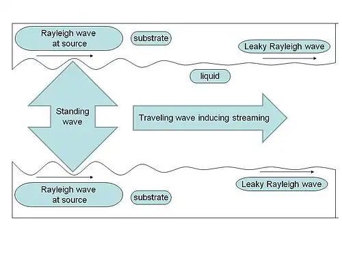 Another option for instigating acoustic streaming results from the attenuation of surface acoustic waves (SAW) in contact with a fluid medium [6]. In this case, the transverse component of a Rayleigh wave (or a Lamb wave) propagating along a surface in contact with a fluid is effectively transferred into a compression wave in the fluid. The energy in the SAW is dissipated by the fluid and little disturbance is felt in the substrate far from the SAW source (interdigital piezo actuators). Figure 8 is a cartoon of the principle.