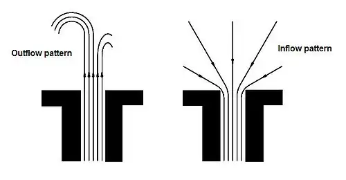 Figure 2: Outflow and inflow patterns - Gedeon streaming: Associated with travelling wave, as opposed to a standing wave as for the previous example. In boundary layer and jet driven streaming, there is no net mass transport. In travelling wave streaming, a non-zero net mass transport occurs due to the phase between the acoustic velocity and density. Travelling wave streaming in Stirling thermoacoustic engines and refrigerators is called Gedeon streaming or DC flow.
