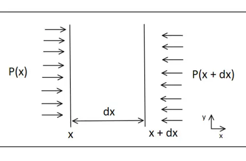 Using Newton's law on the fluid element, the net force acting on the fluid boundaries causes an acceleration on the fluid proportional to its mass,