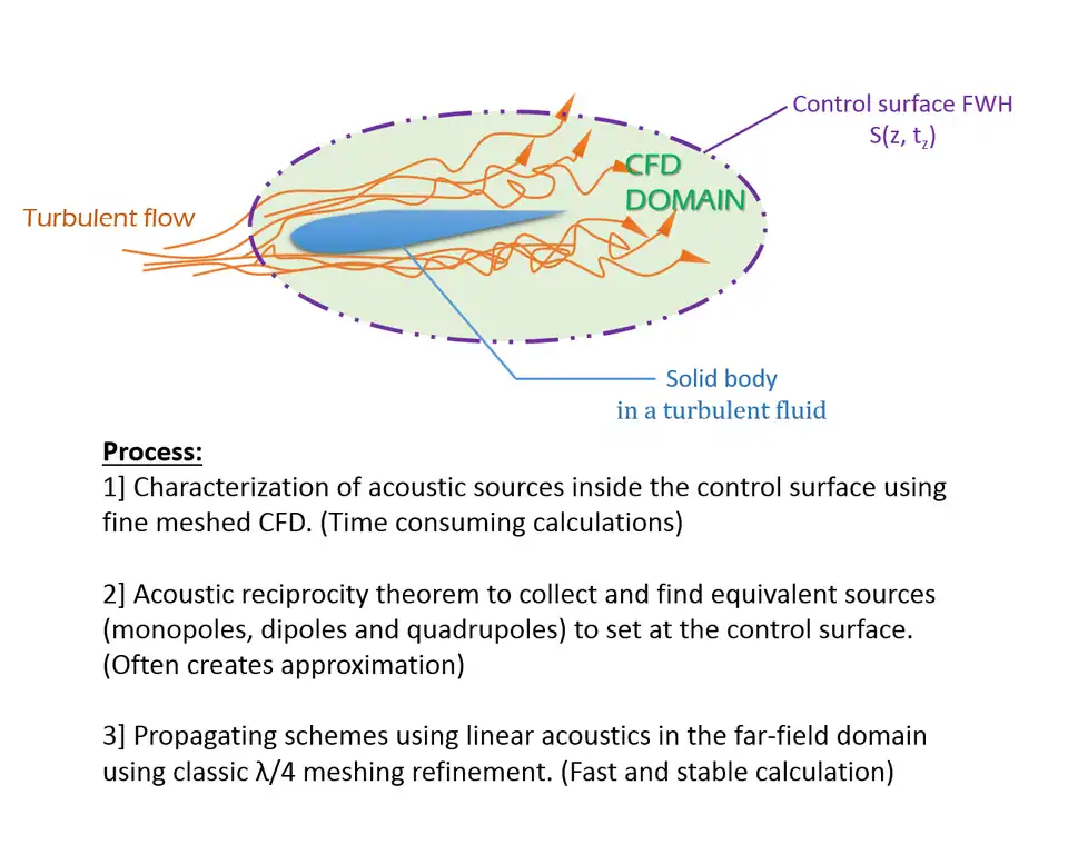 A direct way to predict Aerodynamic noise would be to solve the Navier-Stokes Equations in a general three-dimensional unsteady compressible numerical simulations. Unfortunately, it is hardly achievable except for very simple academic configurations within a delimited region. The idea of an acoustic analogy is to restate the full equations of gas dynamics providing an equivalent wave equation in homogeneous medium in uniform motion from the point of view of a distant observer. This condition leads to simplifications of usual linear acoustics problems[1]. The most systematically used formalisms are Lighthill's analogy and the extensions made by Curle and Ffowcs Williams & Hawkings, because they offer of wide range of applicability.