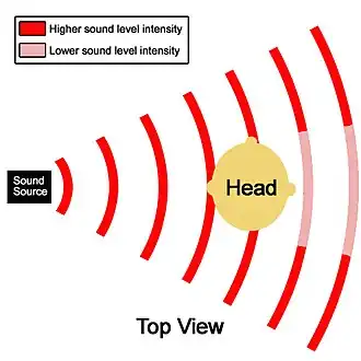 As the frequency increases above 1600 Hz, the dimension of the head is greater than the wavelength of the sound wave. Phase delays no longer allow to detect the location of the sound source. Hence, the difference in sound level intensity is used instead. Sound level is inversely proportional to the source-receiver distance, given that the closer you are to the emitting sound, the higher the sound intensity. This is also influenced greatly by the acoustic shadow cast by the head. As depicted in Figure 3, the head blocks sound, decreasing the sound intensity coming from the source[4].