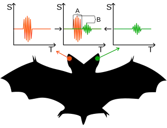 Echolocation is a form of acoustics that uses active sonar to locate objects. Many animals, such as bats and dolphins, use this method to hunt, to avoid predators, and to navigate by emitting sounds and then analyzing the reflected waves. Animals with the ability of echolocation rely on multiple receivers to allow a better perception of the objects’ distance and direction. By noting a difference in sound level and the delay in arrival time of the reflected sound, the animal determines the location of the object, as well as its size, its density, and other features. Humans with visual disabilities are also capable of applying biosonar to facilitate their navigation. This page will focus mainly on how echolocation works in bats and dolphins.