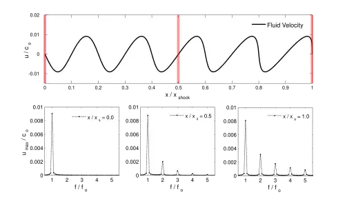 For this particular example the wave amplitude was set to achieve shock formation after five wavelengths. For generality all magnitudes of the solution are given in non-dimensional form. For the fluid, the parameter of nonlinearity was set to B/A = 5.0, which corresponds to fresh water at 20oC.[1] The upper portion of Figure 2 gives the spatial wave profile in which the wave steepening is readily apparent. In the lower three panels of Figure 2, the frequency spectrum of the velocity wave is shown as while passing through the regions indicated by red bands. The frequency spectrum plots were obtained using Discrete Fourier transform (DFT) of the calculated time domain signal at each indicated location.