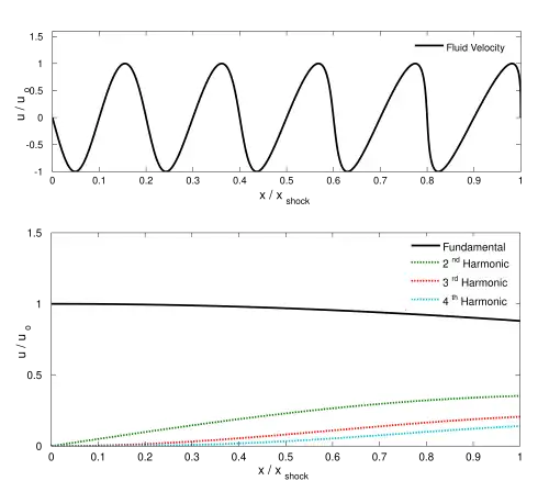 Where Jn is the Bessel function of the first kind. Historically, the subsequent work by Blackstock in 1966 [3] clarified the physical implications of this solution somewhat and also brought this solution to a wider audience in nonlinear acoustics. For additional details on this derivation refer to the texts by Pierce,[1] Elfno,[5] or Hamilton.[2] For completeness, Figure 3 plots the continuous harmonic profile as a function of normalized propagation distance. The wave conditions are the same as those used in calculations for Figure 2. In this particular example the shock formation occurs at five wavelengths; however, the plotted harmonic profile is general to any value of xshock.