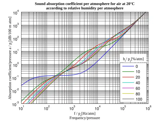 Figure 2 - Attenuation coefficient for atmospheric absorption per atmosphere as a function of frequency and relative humidity, for air at 20 °C.[8] [9]