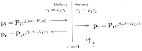 Notice that the frequency of the wave remains constant across the boundary, however the specific acoustic impedance changes across the boundary. The propagation speed in each medium is different, so the wave number of each medium is also different. There are two boundary conditions to be satisfied: