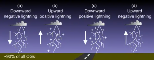 There are two main types of lightning discharges: cloud-to-ground (CG) and intra-cloud (IC), the latter accounting for about 3/4 of all discharges (there are however other types of discharges that are less commonly encountered such as ball lightning).