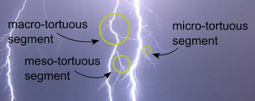 Lightning channels are not straight channels with perfectly circular gas dynamic expansion and hence the tortuosity of these must be accounted for. It was for this reason that A. A. Few derived three different levels of tortuosity in lightning rods. Macro, meso and micro-tortuous segments can be qualitatively observed in any CG discharge. It was found that macro- and meso-tortuous segments are very important in organizing the pulses and acoustic behaviour of a CG discharge.[5] Through computational studies, it was found that 80% of the acoustic energy is released at a 30 degree angle of the plane perpendicular to the main axe of a macro tortuous discharge. It is in this region that an observer will hear a loud clap sort of thunder whereas one placed outside this region will hear a rumbling sort of thunder.