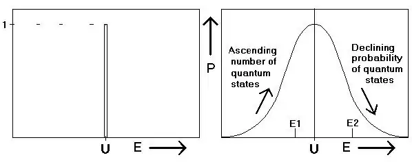 In both figures the vertical coordinate is the probability of a system to be at energy level E. The left hand picture displays the situation in an ‘isolated’ system, P being unity: the system is always at the energy level U. The right hand picture gives the situation in the same system, being in equilibrium with a heat bath. Due to thermal motion its energy is fluctuating about the mean value U. The fluctuations are so small that they can not be detected calorimetrically, but on an atomic scale they are important.