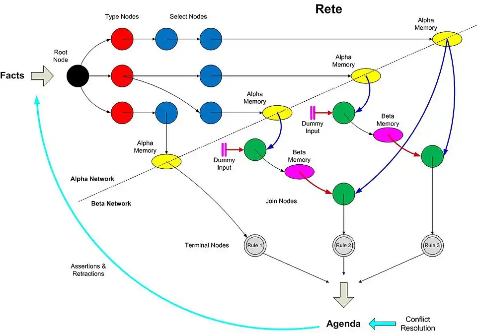 • It stores partial matches when performing joins between different fact types. This, in turn, allows production systems to avoid complete re-evaluation of all facts each time changes are made to the production system’s working memory. Instead, the production system needs only to evaluate the changes (deltas) to working memory.