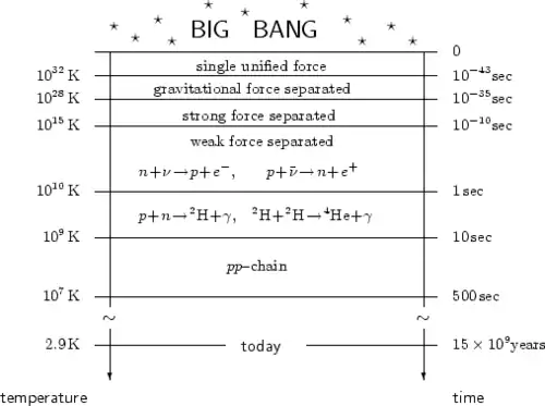 Nowadays, the most popular theory, describing the history of the universe, is the so-called Big-Bang model. The diagram given in Fig. 15.11, shows the sequence of events which led to the creation of matter in its present form.