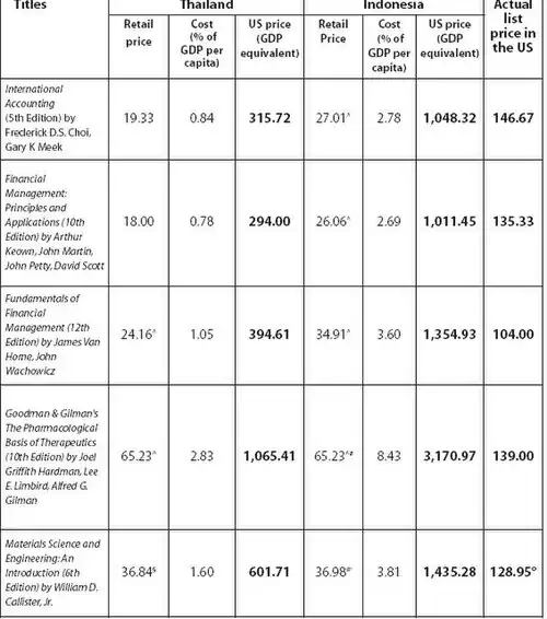 Nevertheless, lower prices of textbooks do not translate to more affordable books.When the price of a book is considered in the context of a country’s GDP per capita (i.e. the average individual income), it becomes apparent that these books remain prohibitively expensive to the average Indonesian and Thai.When a student in Indonesia is made to pay US$81.70 for an older edition of Goodman & Gilman’s The Pharmacological Basis of Therapeutics, it is equivalent to a student in the US paying US$3,170.97 for the same book.Even when a comparison is made using the GDP per capita calculated at purchasing power parity (PPP) exchange rate, so that the standard of living in different countries is taken into account, the prices are still prohibitive.Using the same book as an example, when a student in Indonesia is made to pay US$81.70 for the book, it is equivalent to a student in the US paying US$913.07 for the same book.[ 39 ]