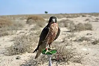 The Peregrine Falcon (Falco peregrinus), sometimes formerly known in North America as Duck Hawk, is a medium-sized falcon about the size of a large crow: 38-53 cm15-21 in long. The English and scientific species names mean "wandering falcon", and refer to the fact that some populations are migratory. It has a wingspan of about 1 meter40 in. Males weigh 570-710 grams1.3-1.6 pounds; the noticeably larger females weigh 910-1190 grams2.0-2.6 pounds.