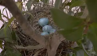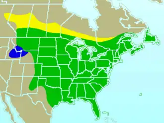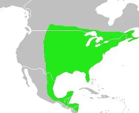 Their breeding habitat is open and semi-open areas across North America east of the Rocky Mountains. The nest is a well-concealed cup in dense trees (particularly pine) or shrubs, usually near water; sometimes, they will nest in cavities or in man-made structures. They often nest in colonies, some being quite large.