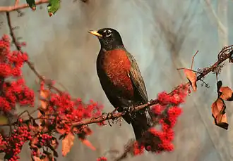 The American Robin has gray upperparts and head, and orange underparts, usually brighter in the male. Robins are frequently seen running across lawns, picking up earthworms by sight. In fact, the running and stopping behavior is a distinguishing characteristic. When stopping, they are believed to be listening for the movement of prey.