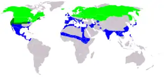 The range maps presented here are color-coded, with yellow indicating the summer range, blue indicating the winter range, and green indicating the year-round range. Some of the range maps do not follow this color code, but it is not difficult to decode them.