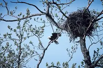Old eyries may be 2 meters6.6 ft in diameter and 1 meter3.3 ft in height, as the eagles enlarge their nests every year. If the eyrie is situated on a tree, supporting tree branches may break because of the weight of the nest.