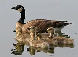 The black head and neck with white "chinstrap" distinguish this goose from all except the Barnacle Goose, but the latter has a black breast, and grey, rather than brownish, body plumage. There are seven subspecies of this bird, of varying sizes and plumage details, but all are recognizable as Canada Geese. Some are hard to distinguish from the Cackling Goose (Branta hutchinsii), with which the Canada Goose was long assumed to form one species; the name Lesser Canada Goose is, confusingly, often applied to B. hutchinsii.
