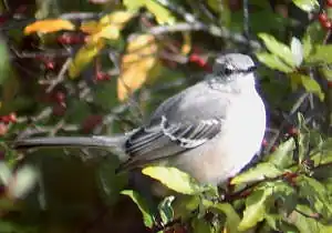 The Northern Mockingbird builds a twig nest in a dense shrub or tree, which it aggressively defends against other birds and animals, including humans. When a predator is persistent, Mockingbirds from neighboring territories, summoned by a distinct call, may join the attack. Other birds may gather to watch as the Mockingbirds harass the intruder. This bird is mainly a permanent resident, but northern birds may move south during harsh weather. Mockingbirds have a strong preference for certain trees such as maple, sweetgum, and sycamore. They generally avoid pine trees after the other trees have grown their leaves. Also, they have a particular preference for high places, such as the topmost branches of trees. Although many species of bird imitate other birds, the Northern Mockingbird is the best known in North America for doing so. It not only imitates birds but also other animals and mechanical sounds.