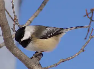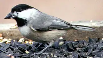 Adults have a black cap and bib with white sides to the face. Their underparts are white with rusty brown on the flanks; their back is grey. They have a short dark bill, short wings and a moderately long tail. There are two types of Chickadee; the Carolina Chickadee, and the Black-capped Chickadee. Carolina Chickadees are so similar to Black-capped Chickadees that they themselves have trouble telling their species apart. Because of this they sometimes mate producing hybrids. The most obvious difference between the three chickadees is that the Carolina Chickadee sings four-note song, Black-capped ones sing two-note songs, and the hybrids sing three-note songs. The song of the Black-capped is a simple, clear whistle of two notes, identical in rhythm, the first roughly a whole-step below the second. This is distinguished from the Carolina chickadee's four-note call fee-bee fee-bay; the lower notes are nearly identical but the higher fee notes are omitted, making the Black-capped song like bee bay.
