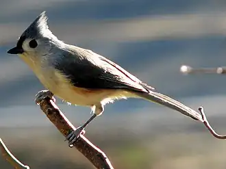 These birds have grey upperparts and white underparts with a white face, a grey crest, a dark forehead and a short stout bill; they have rust-colored flanks. The male and female have identical plumage.