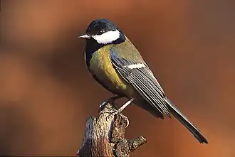 The Great Tit, Parus major, is a passerine bird in the tit family Paridae. It is a widespread and common species throughout Europe and Asia in any sort of woodland. It is resident, and most Great Tits do not migrate.