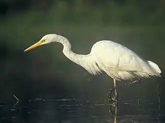 The Great Egret is a large bird with all white plumage, as much as 101 cm The Great Egret feeds in shallow water or drier habitats, spearing fish, frogs or insects with its long, sharp bill. It will often wait motionless for prey, or slowly stalk its victim. It is a conspicuous species, usually easily seen. The Great Egret is partially migratory, with northern hemisphere birds moving south from areas with cold winters. It breeds in colonies in trees close to large lakes with reed beds or other extensive wetlands. It builds a bulky stick nest. The call at breeding colonies is a loud croaking "cuk cuk cuk". | |
