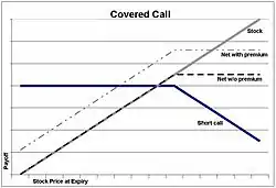 A covered call is a financial market transaction in which the seller of call options owns the corresponding amount of the underlying instrument, such as shares of a stock or other securities. If the trader buys the underlying instrument at the same time as he sells the call, the strategy is often called a "buy-write" strategy. In equilibrium, the strategy has the same payoffs as writing a put option.